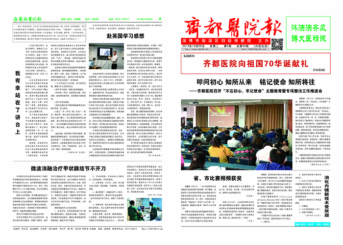 叩问初心 知所从来 铭记使命 知所将往——齐都医院召开“不忘初心、牢记使命”主题教育暨专项整治工作推进会本报讯 9月17日,齐都医院召开专题会,部署第二批“不忘初心、牢记使命”主题教育及专项整治工作。医院为此下发工作方案,要求各党支部根据方案安排,抓紧落实,确保主题教育顺利开展。医院同时成立主题教育暨专项整治工作指导组,将与各支部、各科室加强联系和沟通,指导主题教育高标准、严要求进行。齐都医院党委各支部党员及中层干部参加会议。临淄区卫健局副局长赵剑出席会议并讲话,齐都医院党委副书记刘长辉主持会议。(摄影/燕立光 文/齐宣)省、市比赛频频获奖本报讯 9月27日,“ 2019年淄博市出生缺陷防治技能竞赛市级决赛”落下帷幕,由临淄区人民医院和齐都医院组成的临淄区代表队在决赛中获得全市第二名,理论笔试成绩获得淄博市第一名。其中,齐都医院高雪梅获得“孕前优生”单项个人全市第一名,李康获得“婚前医学检查”单项个人全市第三名。竞赛分为理论笔试和技能操作两部分,考核内容涵盖婚前医学检查、孕前优生健康检查、产前筛查和新生儿疾病筛查4项内容,全市8个区县代表队共32名选手参加。据悉,竞赛由淄博市卫生健康委、市总工会、团市委、市妇联、市人社局联合举办,淄博市妇幼保健院承办。(仇海容)又讯 10月10日, 山东省护理学会举办第八届护理国际论坛暨第一届鲁台护理学术会议和山东省临床护理优秀带教教师征选活动,齐都医院急诊科护士崔芳以 “高级生命支持之团队复苏” 为授课内容参与现场比赛,荣获全省二级医院专场“三等奖”。消化内镜新技术受欢迎本报讯 随着奥林巴斯290消化内镜主机及治疗相关设施的到位,近日,消化内科主任张继旭、副主任王仁波在麻醉科钱迪医师、内镜室王海霞主管护师的通力合作下,共同完成一例四级内镜操作手术--胃窦部内镜下黏膜剥离术。患者目前已经出院,随访得知患者正在康复中。内镜下黏膜剥离术(Endoscopic submucosal dissection, ESD),是近年来出现的一项新的内镜下治疗手段,也是临床应用前景很好的一项技术。该技术能够在内镜下一次性切除早期消化道癌,免除了开腹手术的痛苦与器官切除。与剖腹手术及以往EMR(内镜下黏膜切除术)手术比较,该技术具有以下几个优点:1、创伤小;2、患者可接受多个部位多次治疗;3、医生可以获得完整的组织病理标本以供分析;4、使对于面积较大且形态不规则或合并溃疡、瘢痕的肿瘤进行完整切除变为可能,且减少病变的复发率。该技术主要治疗以下消化道病变:1、早期癌;2、巨大平坦型息肉(LST)3、粘膜下肿瘤等。(消化内科 王仁波)齐都医院向祖国70华诞献礼唱红歌:代表临淄区卫健系统参赛获一等奖本报讯 9月29日,齐都医院代表临淄卫健系统参加淄博市卫生健康系统庆祝新中国成立70周年歌咏比赛并获得一等奖。为隆重庆祝中华人民共和国成立70周年,歌唱伟大的祖国,歌唱伟大的中国共产党,唱响新时代的华美乐章,淄博市卫生健康委在淄博大剧院主办举行了此次歌咏比赛,来自全市卫生健康系统28支代表队近2000名人员参加了比赛。齐都医院合唱团一曲《红旗飘飘,走向复兴》的串烧唱响在淄博大剧院的舞台上,歌声表达了医务人员的爱国主义情怀,展现了齐都医院人的精神风貌。(摄影/战晓萌 冯清斌 文/郭聪)拍视频:唱响祖国生日歌本报讯 在祖国70华诞来临之际,9月28日,由齐都医院出品的国庆献礼MV《今天是你的生日》在齐都医院微信公众号上推出,齐都医院全院职工向祖国70岁生日唱响了生日歌。据齐都医院微信平台后台显示,视频推出一周内,阅读量即达19666人,受众遍及全国32个省。据主创人员介绍,该片进行了近4个月的构思准备,9月5日进入集中拍摄阶段,9月23日杀青,累计拍摄素材500多G。拍摄先后动员医院职工约800多人次,拍摄场景包括临淄高铁北站、足球小镇、天齐渊、人民广场、太公湖、齐文化博物院、齐都体育城、晏婴公园、马莲台地质公园、孔子闻韶处、稷下学宫、国家非物质文化遗产鹧鸪戏文化广场等几十个外场景以及围产医学中心、国家妇科内镜与微创培训基地等院内场景。包括导演、统筹、摄像、后期、剧务、灯光、歌唱演员、艺术指导、化妆等在内的全班人员全部由医院各科室职工组成,大家兼顾工作和拍摄,为拍摄得以顺利进行提供了大力支持。该片抒发了齐都医院全院职工歌唱祖国的豪迈情怀,同时展现了临淄的人文风情。(齐宣)亲历者讲述:第12个“国庆宝宝”今年是建国70周年,10月1日当天,在这个举国欢庆的日子里,我们齐都医院产科一个个“国庆宝宝”平安降生。夜里22点50分,当人们带着欢度国庆的喜悦进入梦乡时,齐都医院的产房却发生了惊心动魄的一幕……夜班接班后,待产室有两位产妇,宫口都已开大2厘米多,她俩都选择的是无痛分娩,基本感觉不到疼痛,正在休息。21:30分,其中一名产妇的胎心监护出现了减速,我们立即给予了变换体位和吸氧,可是情况没有改善,为了确保孩子安全,值班医生立即为其准备手术。刚送入手术室后,产房的门铃又急促地响了起来,原来是急诊科护士推着轮椅送来了一位孕妇。孕妇这次怀的是二胎,破水了,宫缩频繁,疼得厉害,而且自己说想要往下用力。我赶紧协助她躺在检查床上帮她退去衣服检查,发现两只小脚丫已露出阴道口外。
