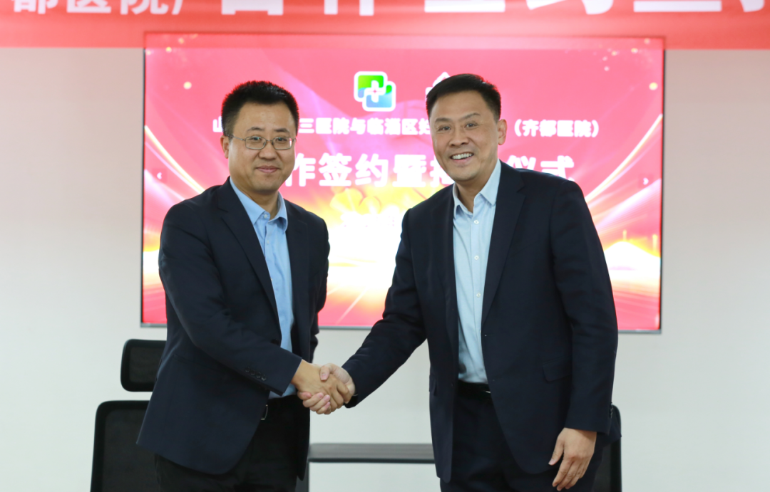 山东省立第三医院事业发展部主任张璞与临淄区妇幼保健院(齐都医院)党委副书记、院长刘稳共同为转会诊中心揭牌;