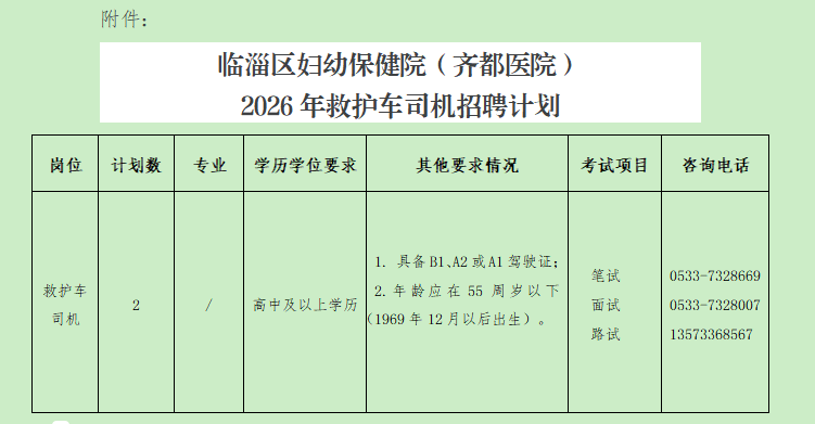 招聘岗位具体要求及咨询电话,详见《临淄区妇幼保健院(齐都医院)2026年救护车司机招聘计划》(附件)